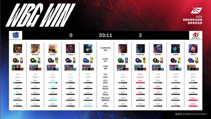 第33分钟,双方野区交战,LNG四人阵亡,WBG推上高地一波结束比赛。