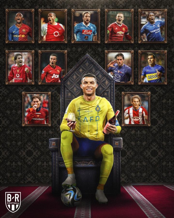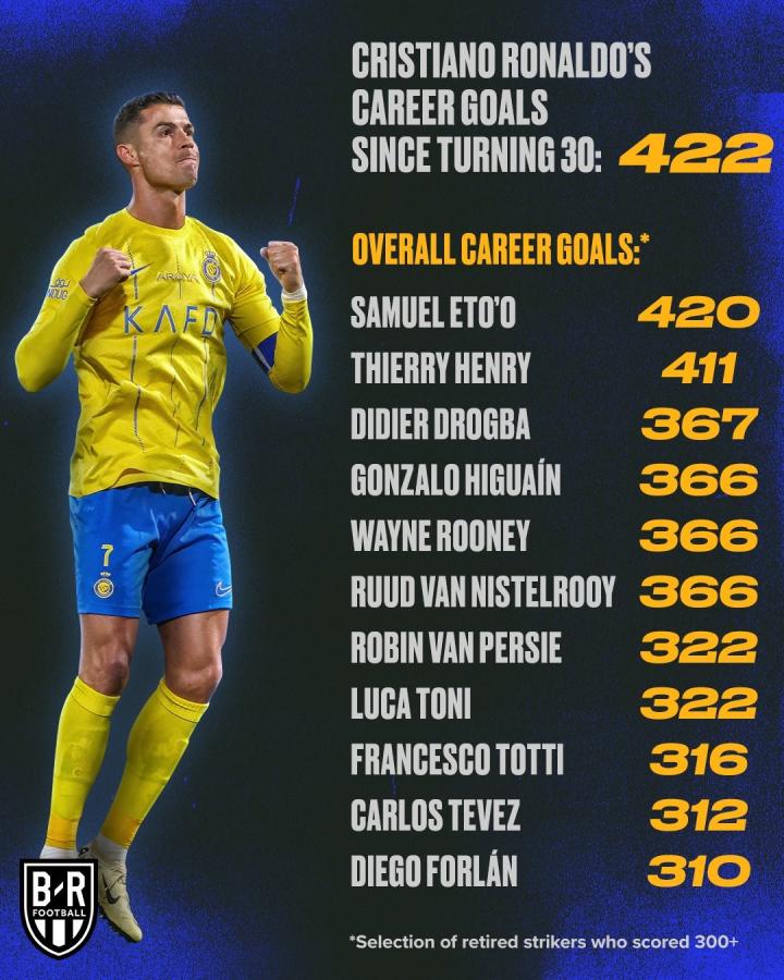 按照B/R Football的统计,现年39岁的C罗在自己30岁之后一共代表皇马、尤文、曼联、利雅得胜利以及葡萄牙国家队打进了422粒进球,这样的数据超越了埃托奥(420球)、亨利(411球)、德罗巴(367球)、伊瓜因(366球)、鲁尼(366球)、范尼斯特鲁伊(366球)、范佩西(322球)、卢卡-托尼(322球)、托蒂(316球)、特维斯(312球)以及迭戈-弗兰(310球)这些传奇球星整个职业生涯的进球数总和。