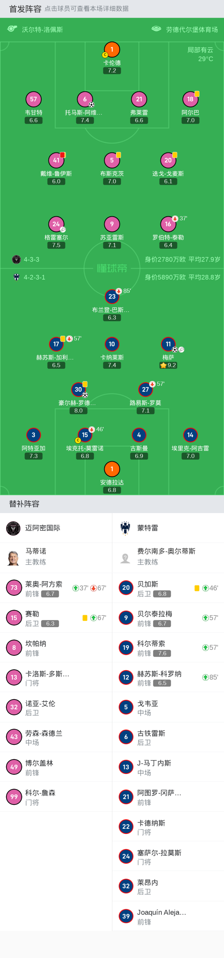 迈阿密国际首发:9-苏亚雷斯, 18-阿尔巴, 5-布斯克茨, 16-罗伯特-泰勒, 21-弗莱雷, 24-格雷塞尔, 57-韦甘特, 1-卡伦德, 20-迭戈-戈麦斯, 41-戴维-鲁伊斯, 6-托马斯-阿维莱斯