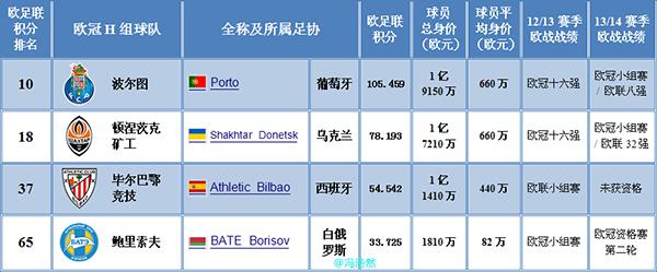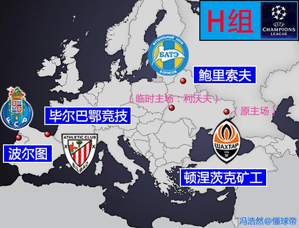 H组由葡超的波尔图、乌超的顿涅茨克矿工、西甲的毕尔巴鄂竞技、白俄罗斯超级联赛的鲍里索夫组成。地理上,东欧邻国与南欧伊比利亚兄弟的对决很具看点。赛程上,波尔图和毕尔巴鄂竞技第五轮都将做客东欧,彼时他们将面临冬季严寒与长途跋涉的双重考验,而对于矿工和鲍里索夫而言,尽管遥远,但伊比利亚半岛实在是再好不过的“旅游胜地”。