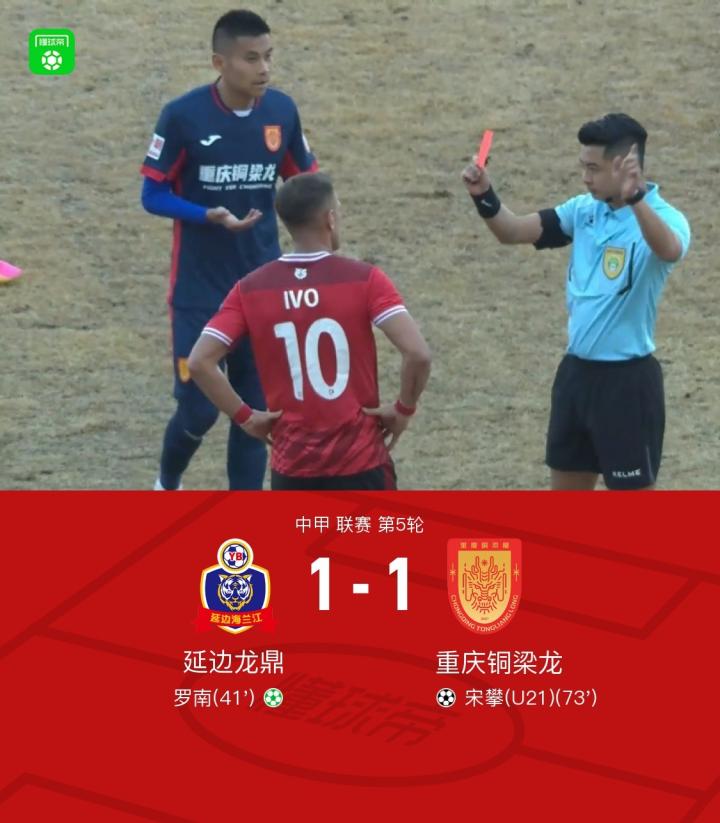 延边龙鼎1-1重庆铜梁龙,裁判两度改判红牌,罗南、宋攀破门