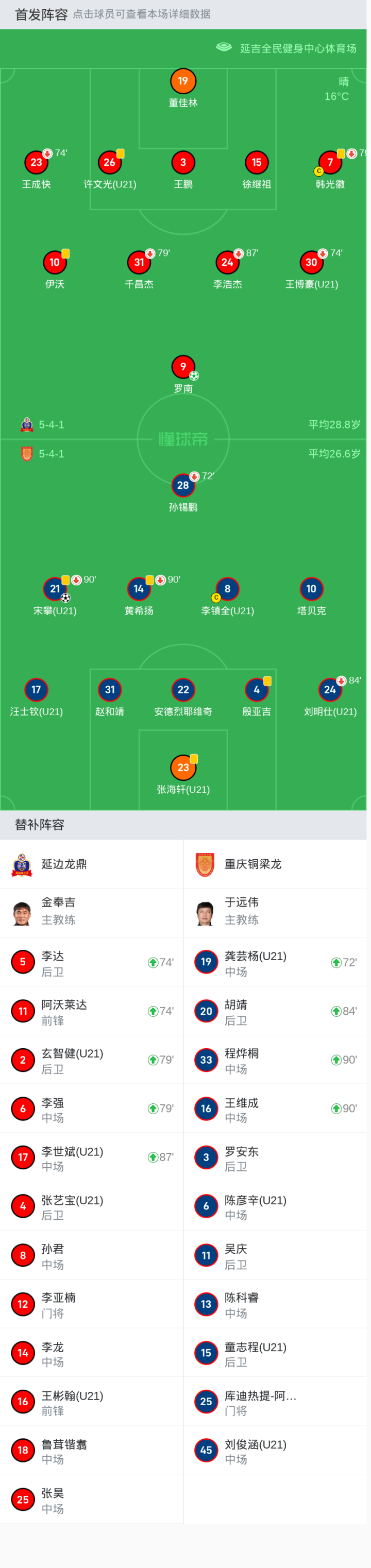 北京时间4月5日中甲 联赛 第5轮,延边龙鼎主场对阵重庆铜梁龙。上半场汪士钦外围远射偏出,张海轩出击拦截犯规,裁判出示直红后改判黄点套餐,罗南操刀点射破门先拔头筹,黄希扬被伊沃撞了一下后倒地,裁判第一时间出示红牌后再次改判一人一黄,下半场塔贝克小角度打门偏出,孙锡鹏禁区头球打门偏出,王鹏解围失败,宋攀破门将比分扳平,全场战罢,最终比分延边龙鼎1-1重庆铜梁龙。