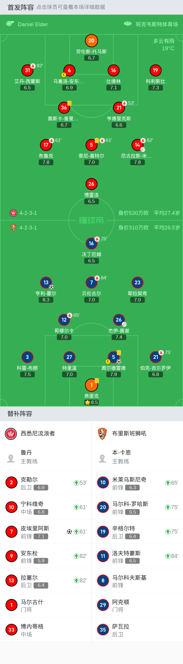 西悉尼流浪者首发:6-马塞洛-安东尼奥, 5-索尼-基特尔, 20-劳伦斯-托马斯, 21-亨德里克斯, 19-科利斯比, 26-博雷洛, 16-比德林, 17-布鲁克, 14-尼古拉斯-米拉诺维奇, 31-艾丹-西蒙斯, 36-奥斯卡-普里斯特曼