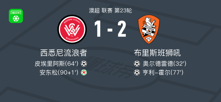 北京时间4月5日澳超 联赛 第23轮,西悉尼流浪者主场对阵布里斯班狮吼。西悉尼流浪者皮埃里阿斯破门。布里斯班狮吼奥尔德雷德破门,亨利-霍尔破门。最终比分西悉尼流浪者1-2布里斯班狮吼。