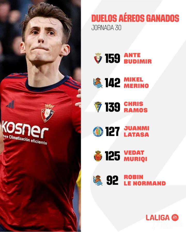 克罗地亚国脚布季米尔正在经历职业生涯迄今为止最好的一个赛季,他已经在30场联赛中攻入16球,与贝林厄姆以及多夫比克暂时并列西甲射手榜第一。除进球外,布季米尔还展现出了优秀的争顶能力。根据西甲官方的统计,截止至第30轮,他共赢得159次空中对抗,是西甲所有球员中最多的,比第二名的梅里诺还多出17次。 消息来源 https://sportklub.n1info.hr/nogomet/budimir-je-kralj-visina-u-jednoj-je-kategoriji-dominantan-u-la-ligi/