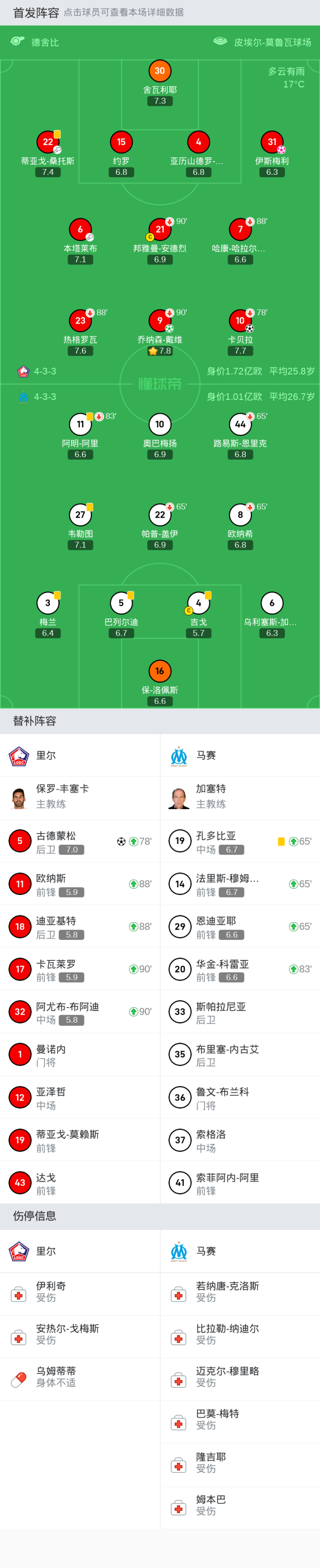 里尔首发:21-邦雅曼-安德烈, 10-卡贝拉, 31-伊斯梅利, 6-本塔莱布, 23-热格罗瓦, 9-乔纳森-戴维, 4-亚历山德罗-里贝罗, 7-哈康-哈拉尔德松, 30-舍瓦利耶, 15-约罗, 22-蒂亚戈-桑托斯