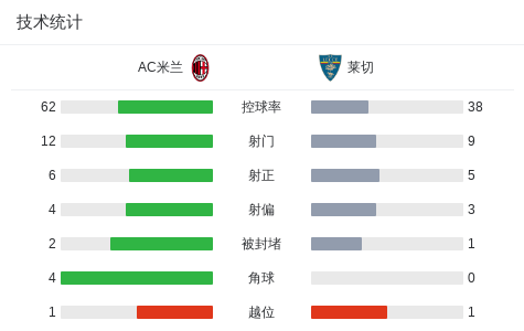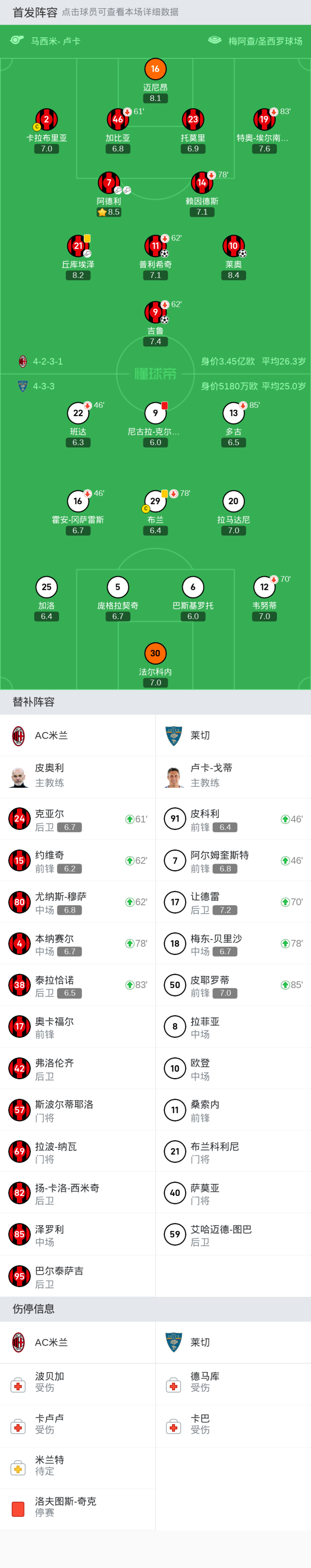 北京时间4月6日21:00,意甲第31轮继续进行,AC米兰坐镇主场圣西罗球场迎战莱切,本场主裁判为卢卡-马西米。上半场,普利希奇世界波闪击,吉鲁头球再下一城,克尔斯托维奇飞踹丘库埃泽被直红罚下。下半场,莱奥单刀破门,阿德利本场完成助攻双响。最终,米兰主场3-0轻取十人莱切。