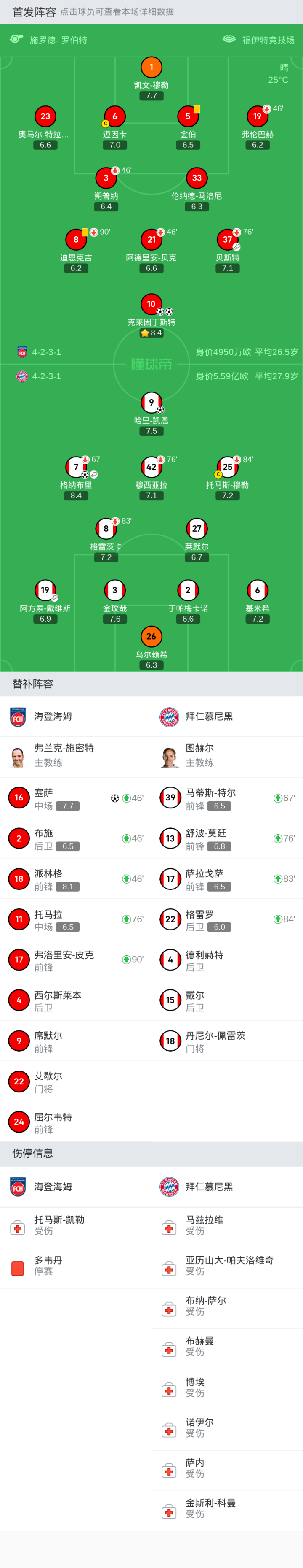 拜仁慕尼黑首发:26-乌尔赖希, 25-托马斯-穆勒, 9-哈里-凯恩, 8-格雷茨卡, 7-格纳布里, 6-基米希, 27-莱默尔, 2-于帕梅卡诺, 19-阿方索-戴维斯, 3-金玟哉, 42-穆西亚拉