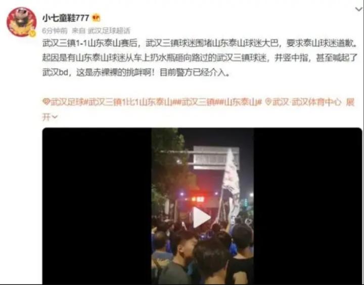 类似的冲突,也发生在山东泰山与武汉三镇球迷之间。2023年6月,远征武汉客场的泰山球迷,不仅无视了主队的礼遇,还在赛后挑衅三镇球迷,甚至喊出了有关疫情的贬损口号。作为回击,愤怒的三镇球迷围住了准备离场的泰山球迷大巴,更有激动者砸碎了大巴的挡风玻璃。