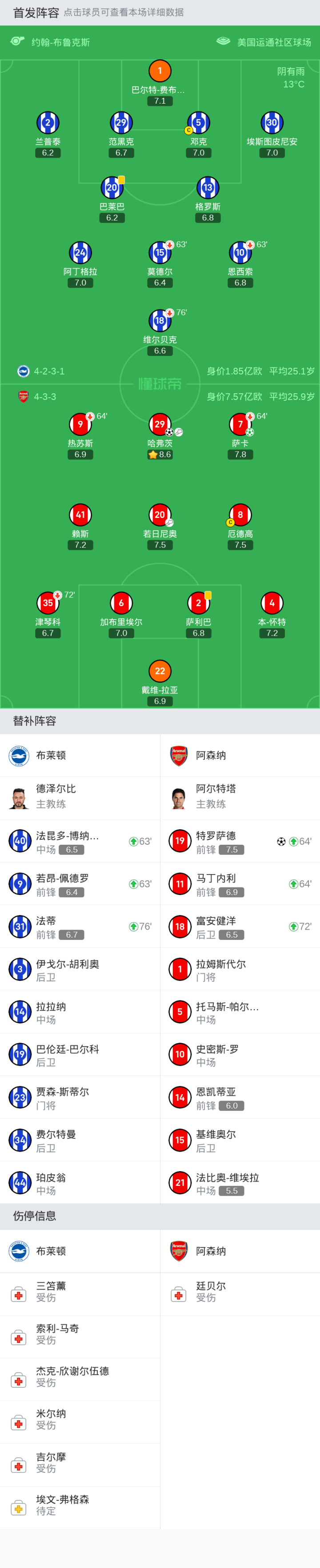 北京时间4月7日00:30,英超第32轮继续进行,阿森纳作客美国运通社区球场挑战布莱顿,本场主裁判为约翰-布鲁克斯。上半场,热苏斯内切造点,萨卡操刀一蹴而就,拉亚献关键扑救。下半场,哈弗茨抢点破门后又助攻特罗萨德弑旧主。最终,阿森纳客场3-0完胜布莱顿。