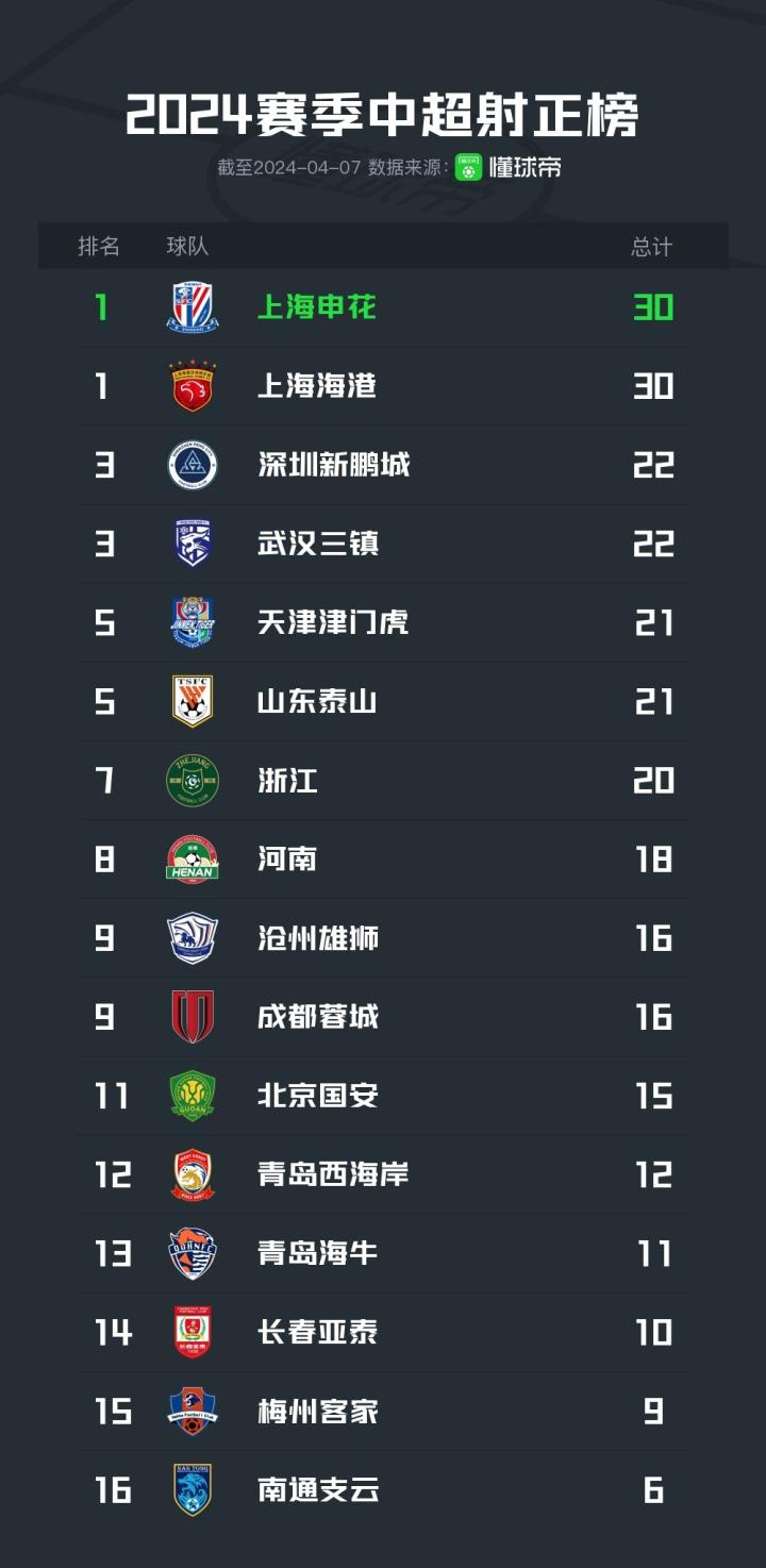 中超前四轮战罢,在球队射正榜中上海双雄申花和海港均射正30次并列最多,新鹏城和三镇以22次射正并列第三,泰山21次射正,国安15次射正排名并列第五和第11。