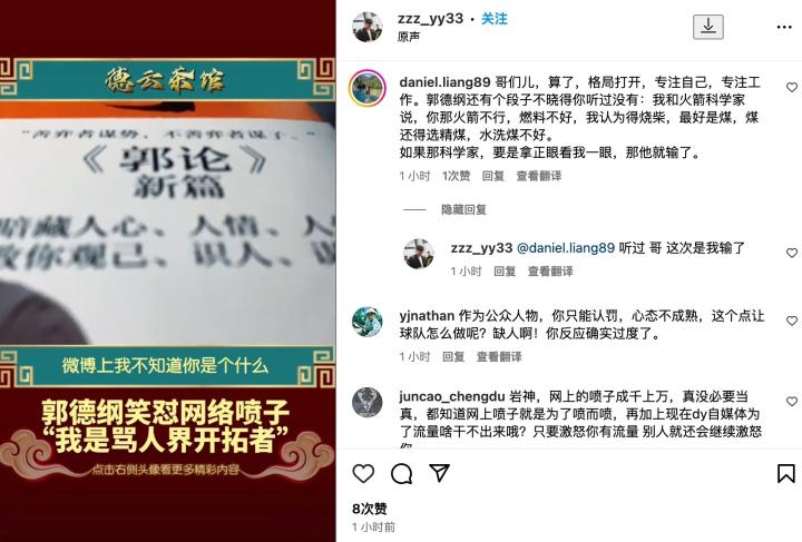 张岩在海外社交媒体账号上再次更新动态,依然是转发了郭德纲的言论。其中评论里有人用“火箭科学家和烧煤炭”的段子来安抚他,他则表示:“听过,哥,这次是我输了。”言外之意就是,他正眼看了不懂球的人。