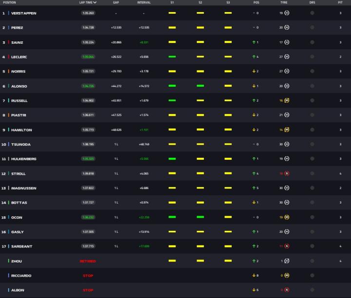 第21圈,维斯塔潘超越勒克莱尔,重新夺回第一。阿隆索超越汉密尔顿来到第7位。