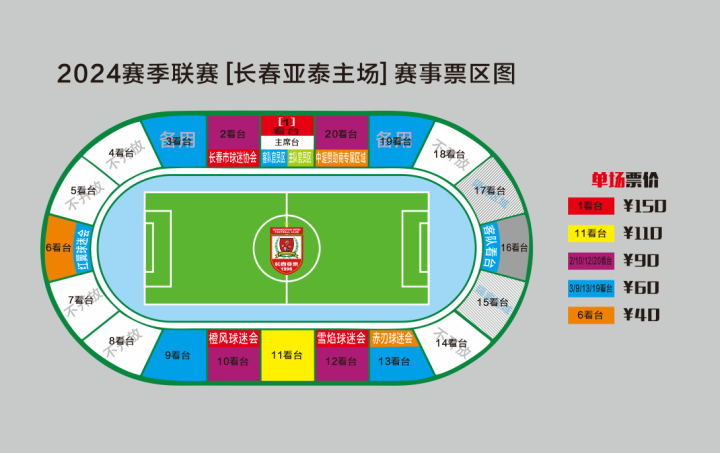 特别提示:2台、6台、10台、12台、13台前排为在俱乐部官方备案的球迷协会专属区域,此区域由各球迷协会在遵守俱乐部相关要求的前提下进行自管,请持零售年卡和单场零售票的球迷入座时避开此区域;1看台售票区域为主席台上方,主席台下方为中超联赛官方区域,不对外售票。