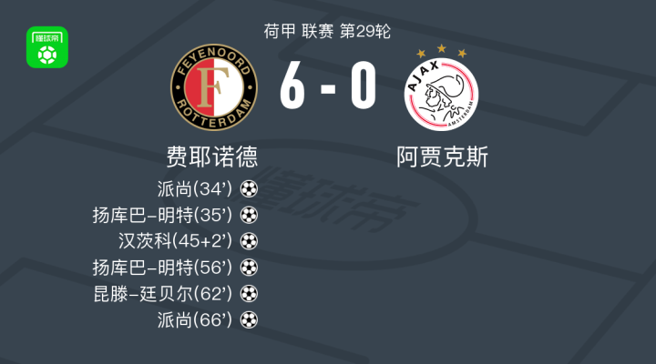 北京时间4月7日荷甲 联赛 第29轮,费耶诺德主场对阵阿贾克斯。费耶诺德派尚梅开二度,扬库巴-明特梅开二度,汉茨科破门,昆滕-廷贝尔破门。最终比分费耶诺德6-0阿贾克斯。
