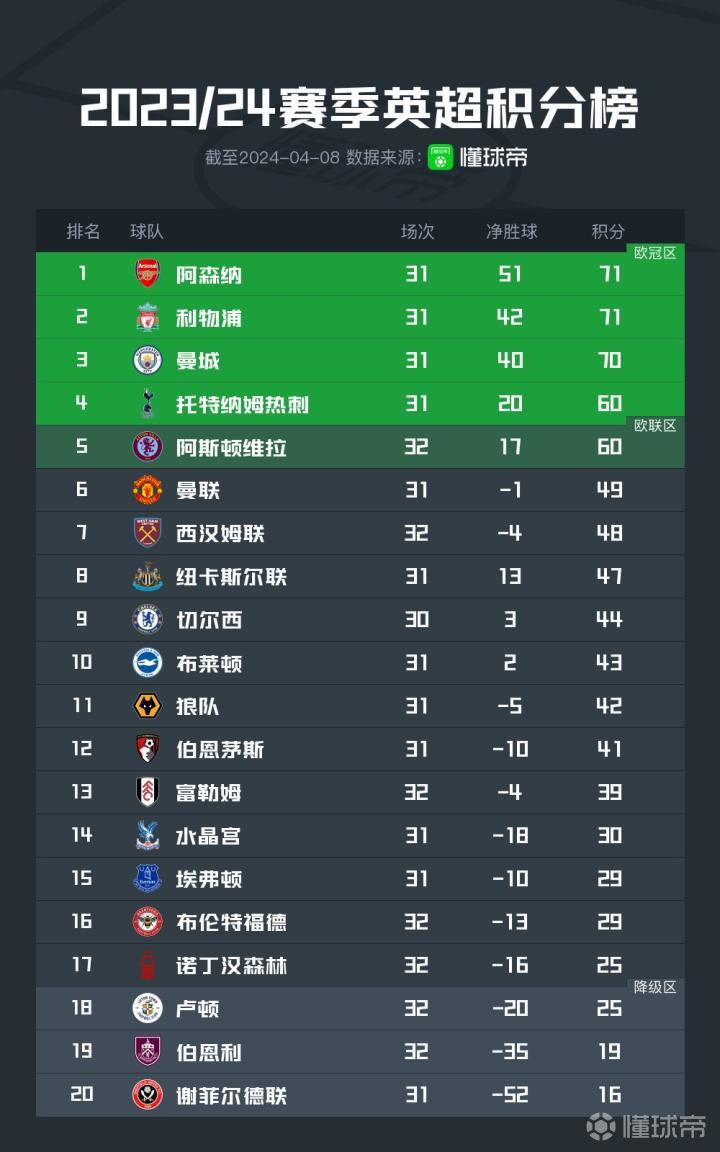 由于利物浦在本轮比赛中只拿到了1分,这使得他们的积分和阿森纳一样是71分,但他们的净胜球只有42个,而阿森纳则凭借9个净胜球的优势成功登顶。