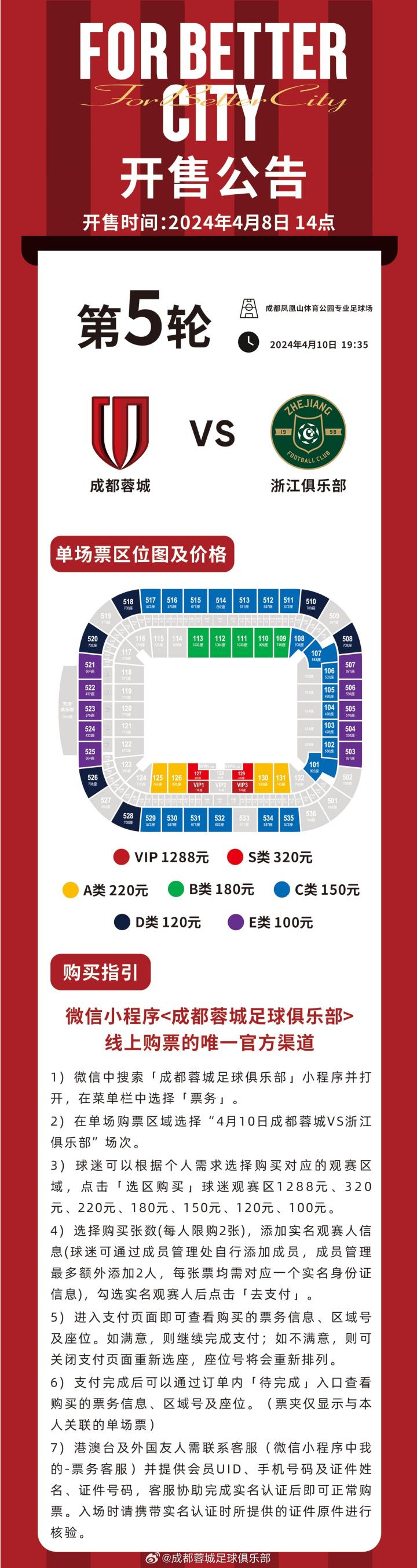 成都主场战浙江球票下午2点开售:最低票价100元,VIP1288元