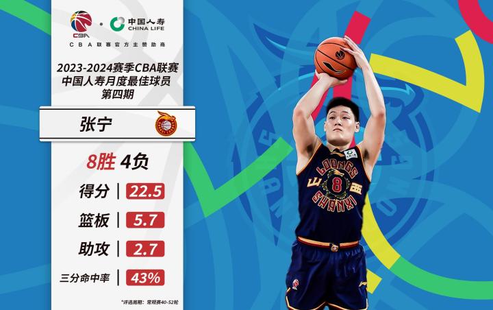 山西汾酒职业篮球俱乐部球员张宁本月出战12场比赛,拿下其中8场胜利,场均出场33分钟的时间里可以得到22.5分、5.7篮板、2.7助攻,同时能够以43%的命中率场均命中3.3记三分。凭借张宁的出色表现,山西汾酒在常规赛第三阶段超越竞争对手,成功锁定季后赛席位。