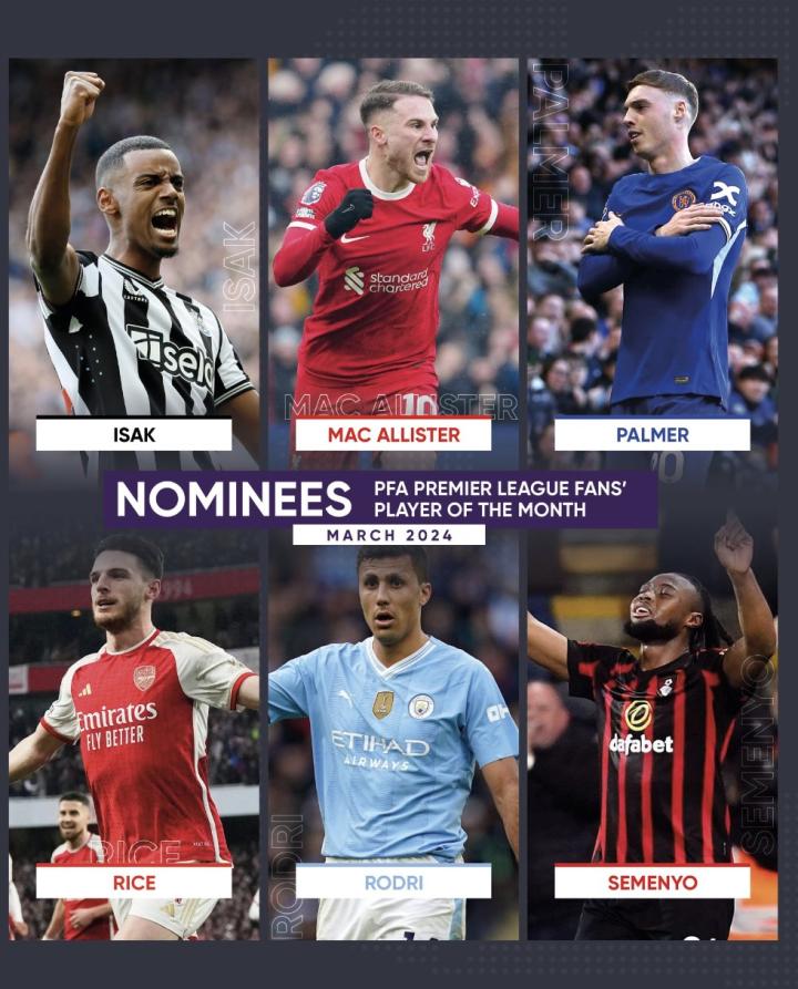 不久前,英格兰职业球员协会(PFA)公布了英超3月最佳球员的候选名单,其中,赖斯、伊萨克、麦卡利斯特、帕尔默等人入选。