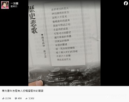 这首新诗名为《历史悲歌》,由南光高中的一名学生创作,并刊登于《南市青年》期刊393号,其中提到了战火蔓延导致家园毁灭的情况,但每句句首相连则暗藏玄机。不少台湾网友感慨:「超級有料」、「原神玩家的素质真的好高」、「這就是文組的實力嗎」、「可莉玩家的勝利」。