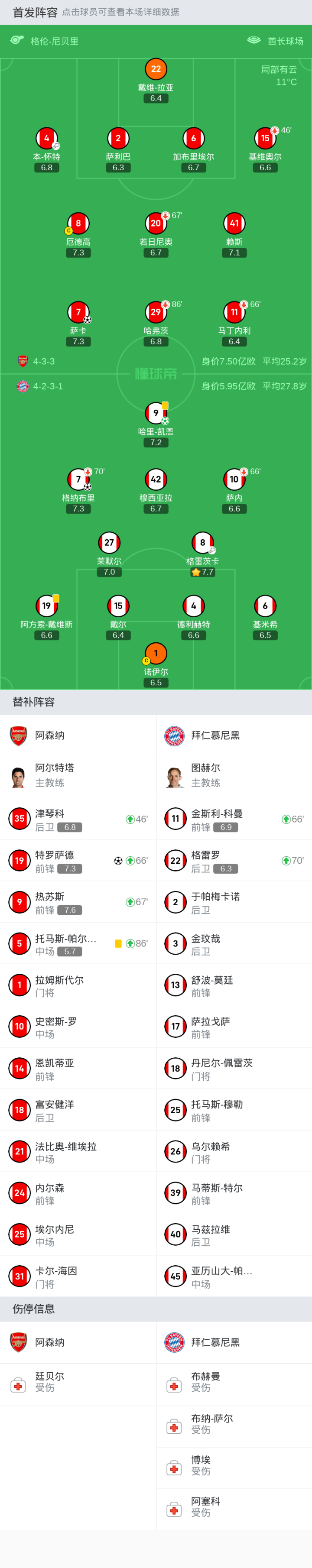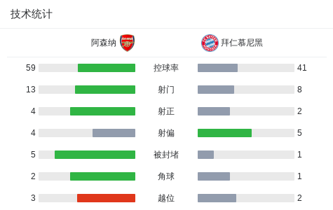 北京时间4月10日欧冠 1/4决赛首回合,阿森纳主场对阵拜仁慕尼黑。上半场,阿方索犯规累积黄牌缺席下场比赛,萨卡兜远角破门先拔头筹,本-怀特抽射被扑,格雷茨卡助攻格纳布里铲射扳平,萨内长驱直入造点后凯恩主罚命中;下半场,莱默尔断球远射打高,格纳布里受伤无法坚持离场,热苏斯晃到防守后助攻特罗萨德破门,科曼近距离抢点中柱,最后时刻萨卡倒在禁区裁判没有判罚。最终比分阿森纳2-2拜仁。