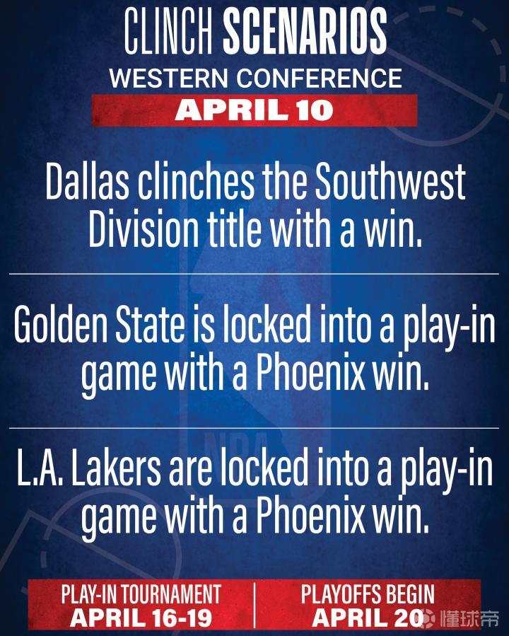 北京时间4月10日,NBA官方发布了明日西部排名分析:若明日太阳赢球,湖人勇士都确定要打附加赛。