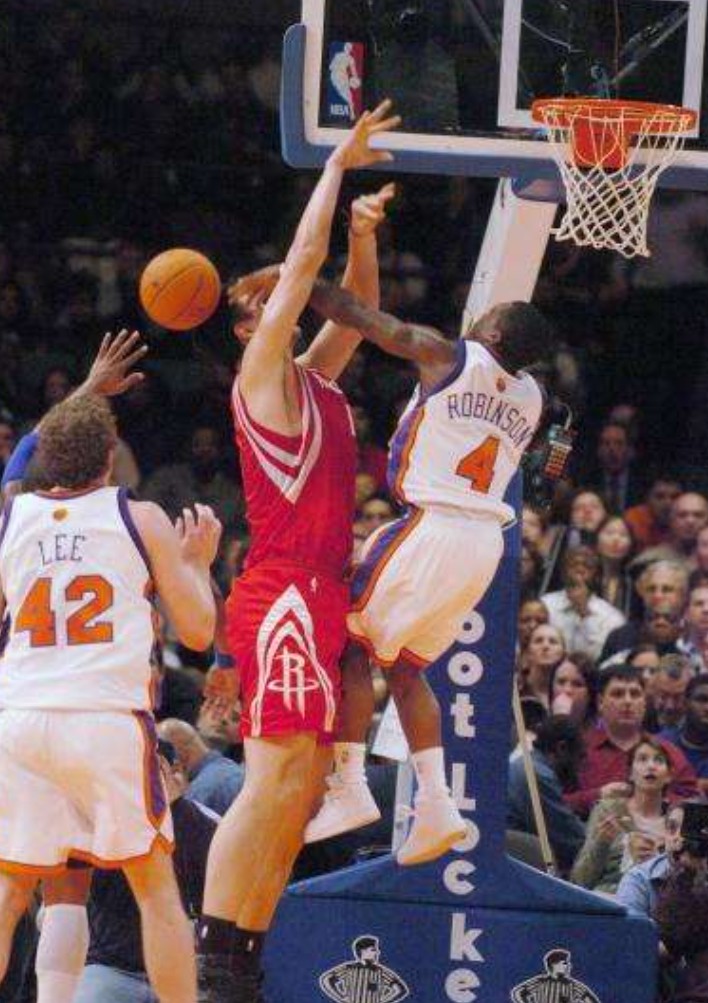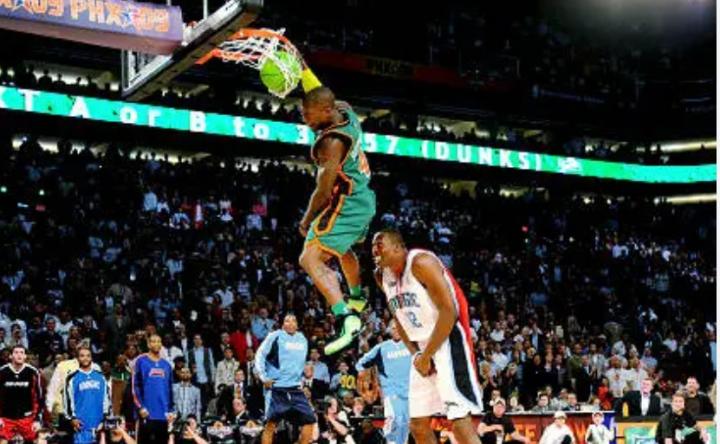 他还曾在2006年对阵火箭的一场比赛中,高高跳起单手盖掉姚明的上篮,而两人的身高差足足有51厘米。