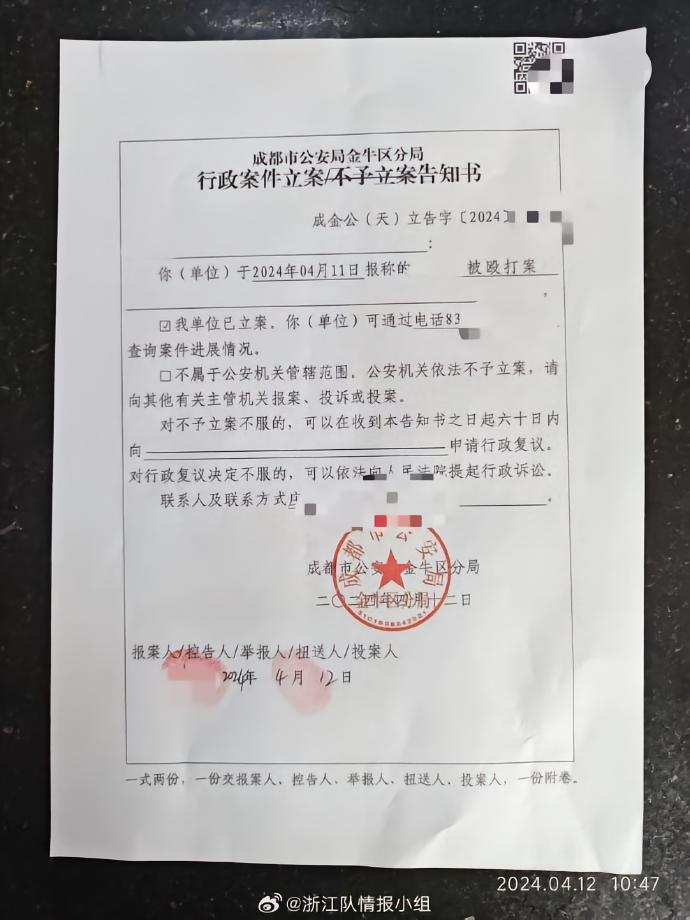 今日,博主浙江队情报小组发布动态,称浙江球迷进场时被成都南看台组织成员殴打,此事成都警方已经正式立案。