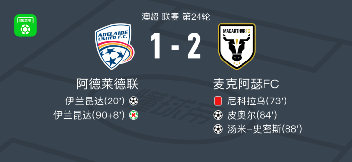 北京时间4月12日澳超 联赛 第24轮,阿德莱德联主场对阵麦克阿瑟FC。阿德莱德联伊兰昆达破门。麦克阿瑟FC皮奥尔破门,汤米-史密斯破门。最终比分阿德莱德联 1-2 麦克阿瑟FC。
