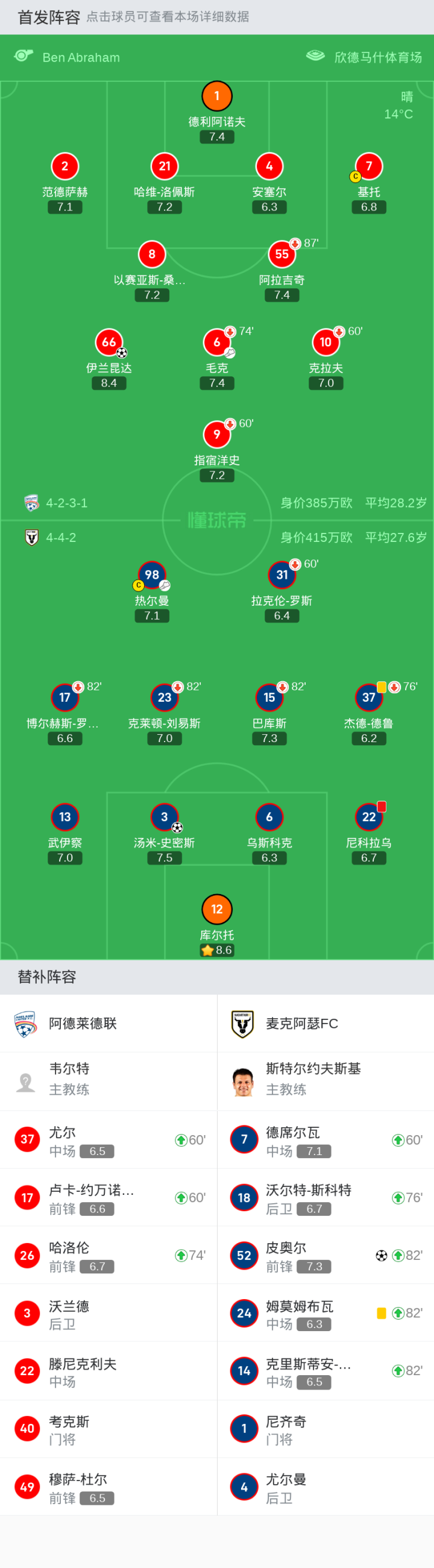 上场替补:60分钟7-德席尔瓦, 76分钟18-沃尔特-斯科特, 82分钟24-姆莫姆布瓦, 82分钟14-克里斯蒂安-波波维奇, 82分钟52-皮奥尔