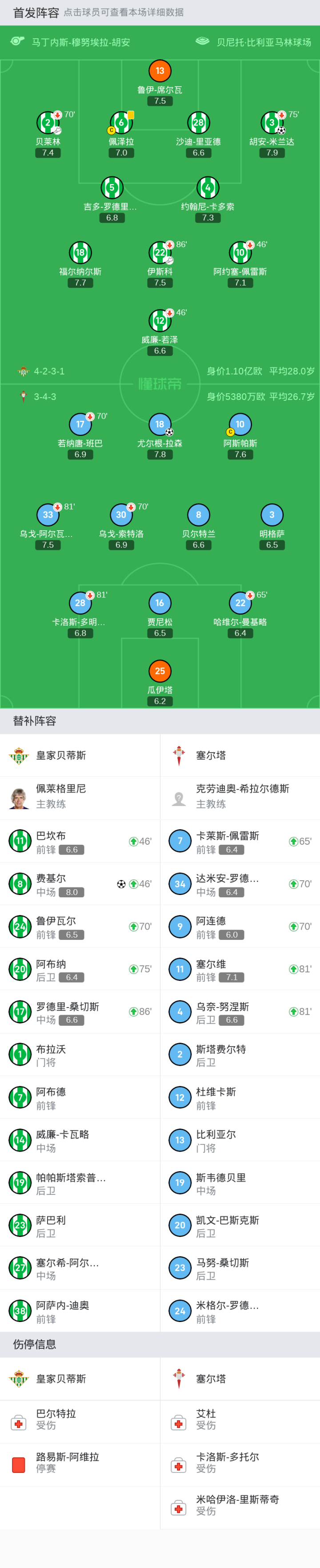 皇家贝蒂斯首发:12-威廉-若泽, 22-伊斯科, 6-佩泽拉, 2-贝莱林, 13-鲁伊-席尔瓦, 10-阿约塞-佩雷斯, 5-吉多-罗德里格斯, 18-福尔纳尔斯, 3-胡安-米兰达, 4-约翰尼-卡多索, 28-沙迪-里亚德