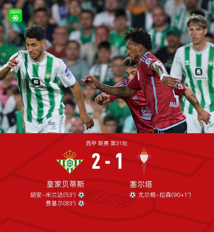 北京时间4月13日,西甲联赛第31轮,皇家贝蒂斯在主场迎战塞尔塔。上半场,尤尔根-拉森小角度抽射被门将扑出,佩泽拉头球攻门顶偏。下半场,胡安-米兰达推射破门,费基尔抽射扩大比分,尤尔根-拉森补时扳回一分,最终,贝蒂斯2-1塞尔塔。