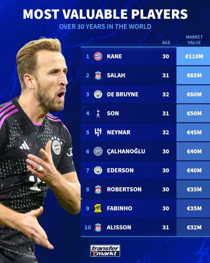 德转列出了世界足坛30岁以上身价排名前10位的球员,哈里-凯恩以1.1亿欧元的身价高居首位,萨拉赫和德布劳内分列2、3位,前10位中英超球员占据6席,此外还有两人曾经效力过英超。