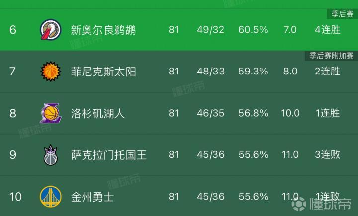 因此,鹈鹕和太阳两队要么第6、要么第7;湖人、国王、勇士三队的排名将在8-10之间。