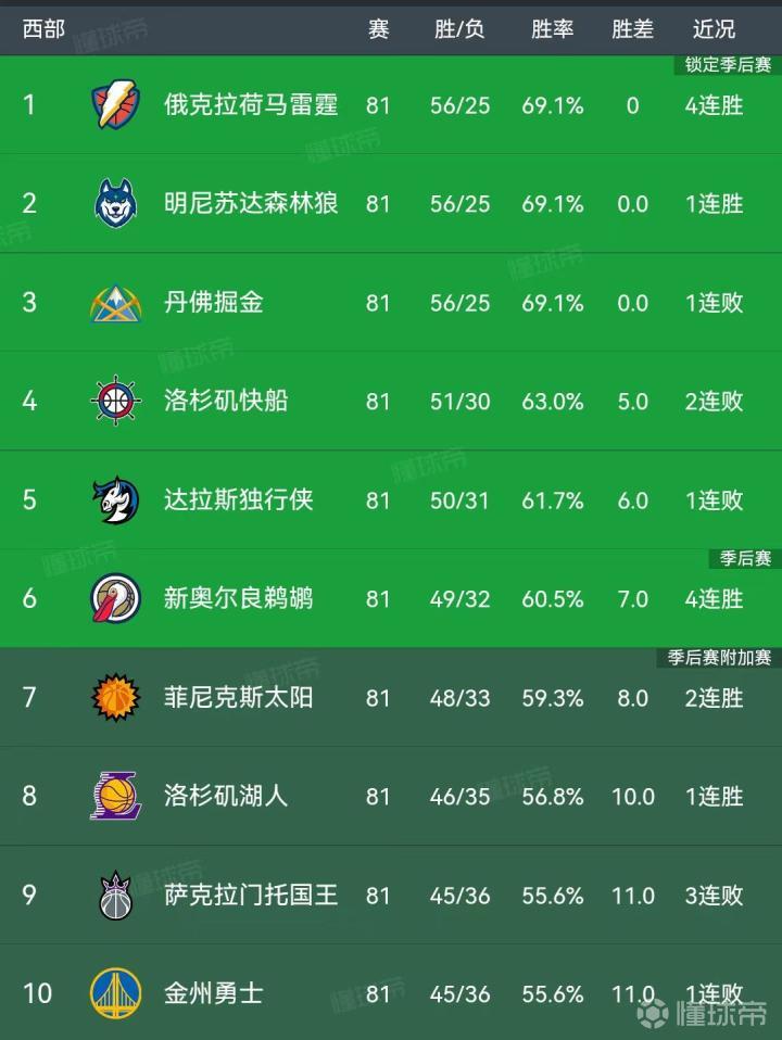 在今天比赛过后,掘金、森林狼和雷霆的战绩同为56胜25负,但雷霆依靠相互交锋战绩优势升至第一,西部常规赛冠军之争将在最后一战见分晓。