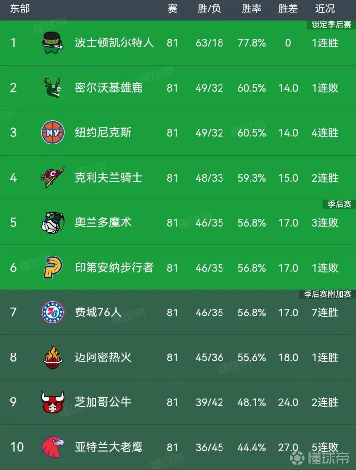 目前东部凯尔特人锁定榜首;公牛和老鹰分别锁定第9和第10,两队将在附加赛决一死战。而其余7支参加季后赛的东部球队的排名均未完全敲定。