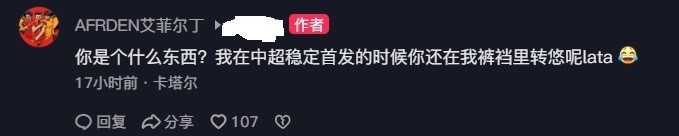 有关首发的问题,该网友的留言似乎已经删除了,艾菲尔丁:“你是个什么东西?我在中超稳定首发的时候你还在我裤裆里转悠呢lata。”