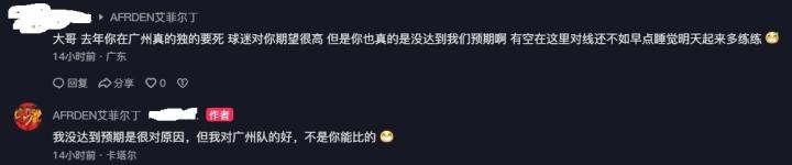 网友:“大哥,去年你在广州真的独得要死,球迷对你期望很高,但是你也真的是没达到我们预期啊。有空在这里对线,还不如早点睡觉明天起来多练练。”