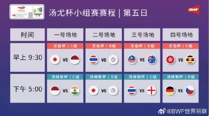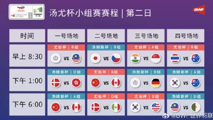 羽毛球汤尤杯小组赛赛程公布:将于4月27日上午8:30开赛