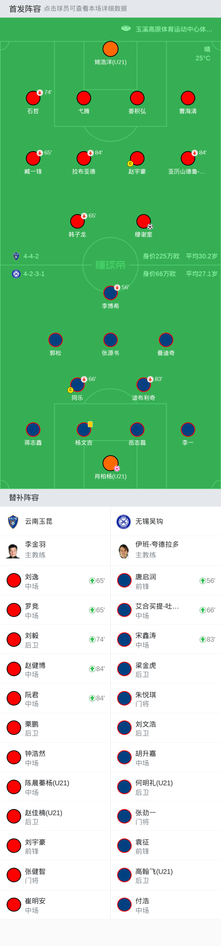 替换下场:84分钟9-拉布亚德, 84分钟10-亚历山德鲁-约尼查, 65分钟36-臧一锋, 74分钟15-石哲, 65分钟27-韩子龙