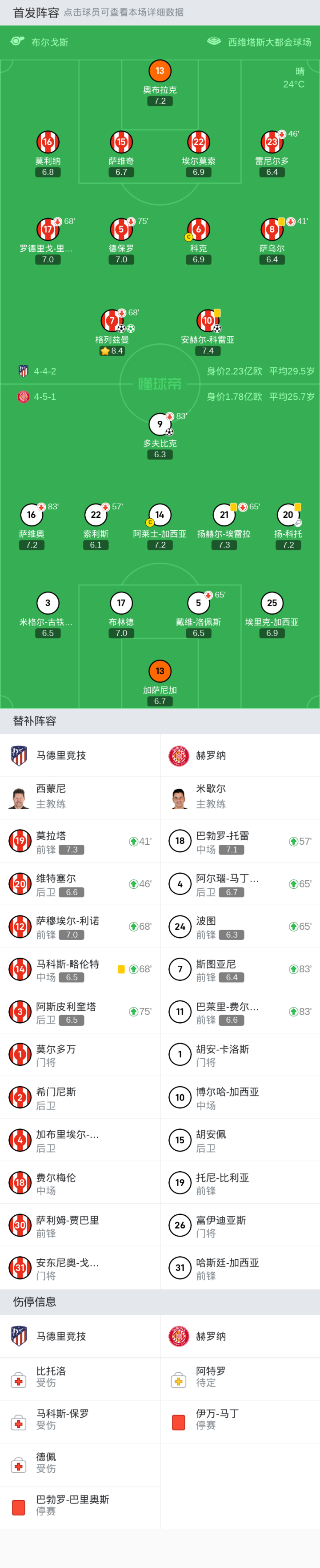 替换下场:68分钟7-格列兹曼, 41分钟8-萨乌尔, 75分钟5-德保罗, 46分钟23-雷尼尔多, 68分钟17-罗德里戈-里克尔梅