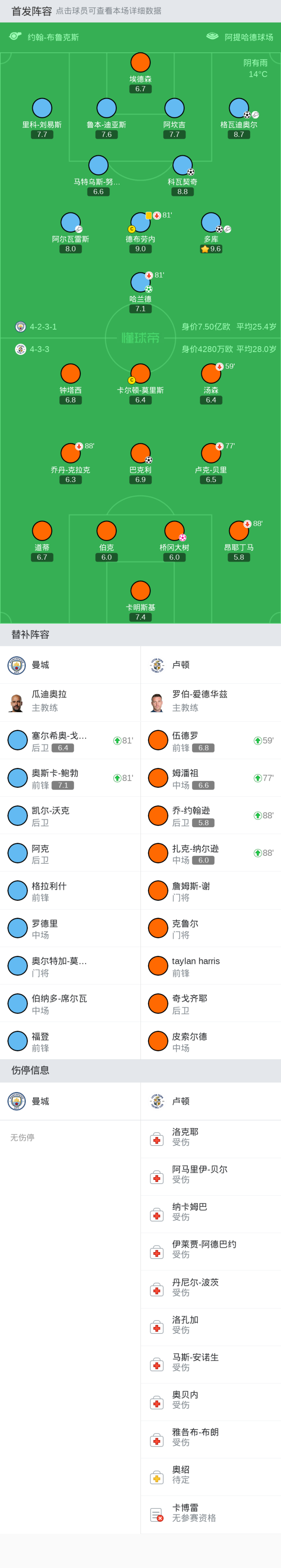 替补:2-凯尔-沃克, 18-奥尔特加-莫雷诺, 6-阿克, 10-格拉利什, 20-伯纳多-席尔瓦, 16-罗德里, 47-福登