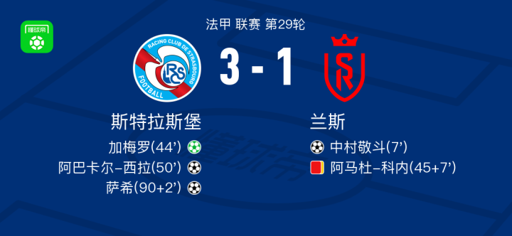 下半场补时第2分钟,阿布巴卡尔-阿卜杜拉助攻斯特拉斯堡球员萨希打入一球。