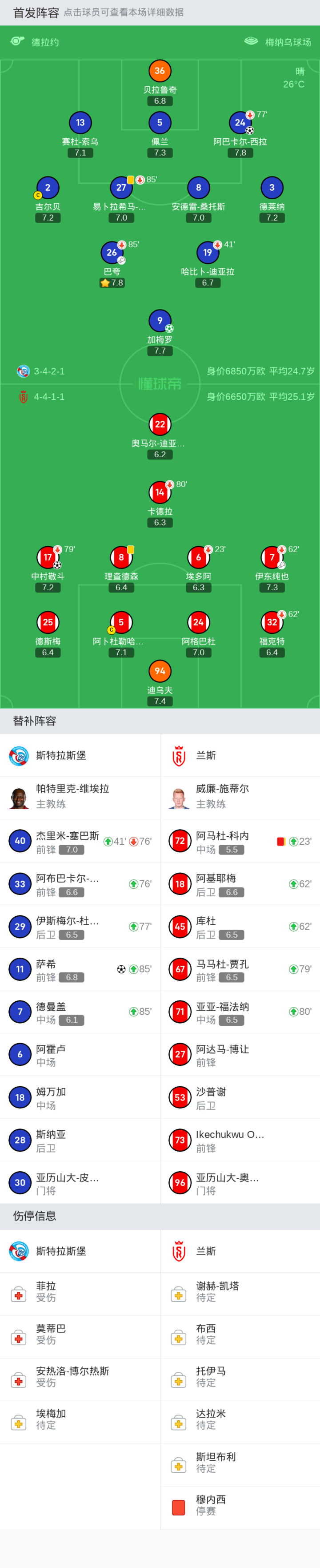 斯特拉斯堡首发:9-加梅罗, 3-德莱纳, 2-吉尔贝, 27-易卜拉希马-西索科, 5-佩兰, 26-巴夸, 36-贝拉鲁奇, 13-赛杜-索乌, 19-哈比卜-迪亚拉, 8-安德雷-桑托斯, 24-阿巴卡尔-西拉