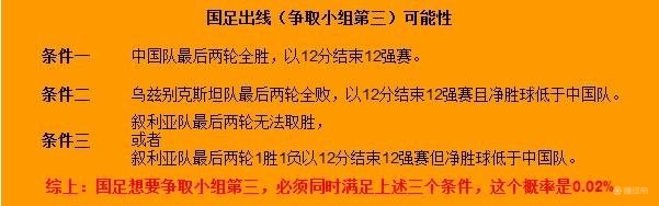 末轮决战前,中国队必须主场取胜十二年未曾赢过的苦主卡塔尔,同时还需满足以下五个条件中的三个方可晋级: