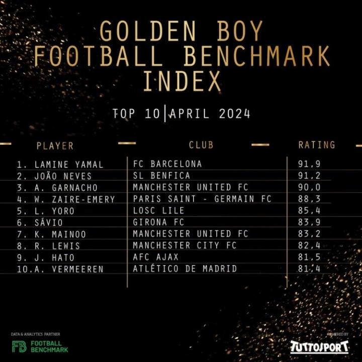 【金童奖基准指数:亚马尔91.9分第一,若昂-内维斯91.2分第二】