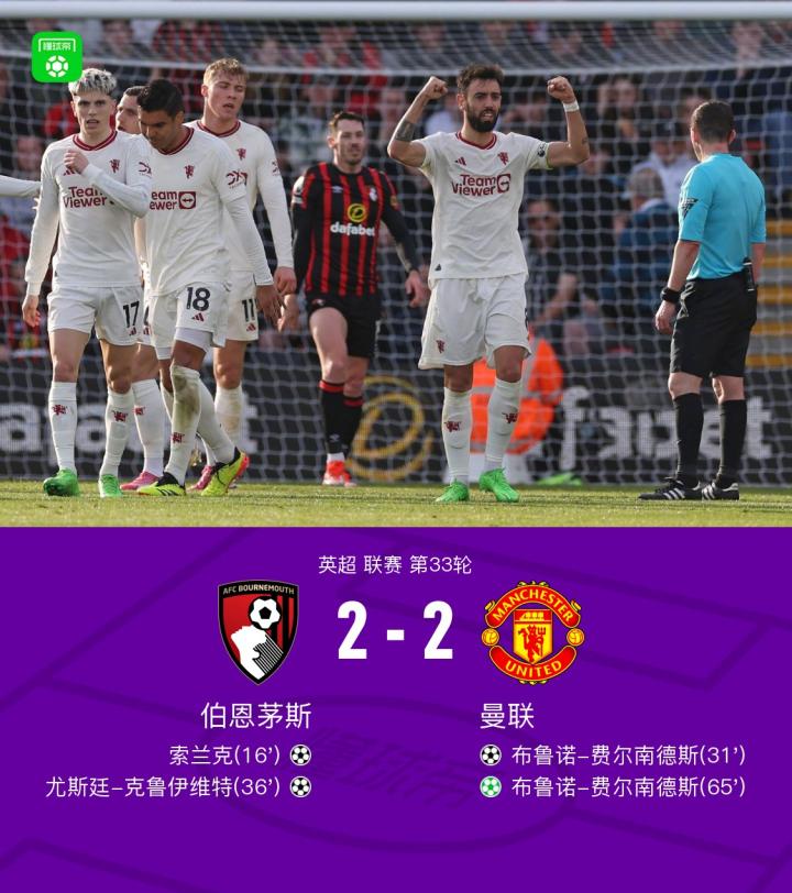 【剑南春|曼联2-2客平伯恩茅斯4轮不胜,B费双响,索兰克破门】