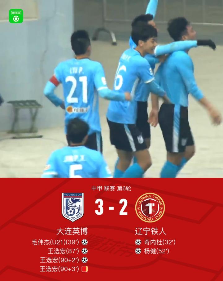【大连英博3-2逆转辽宁铁人,王选宏双响加染红,毛伟杰破门】