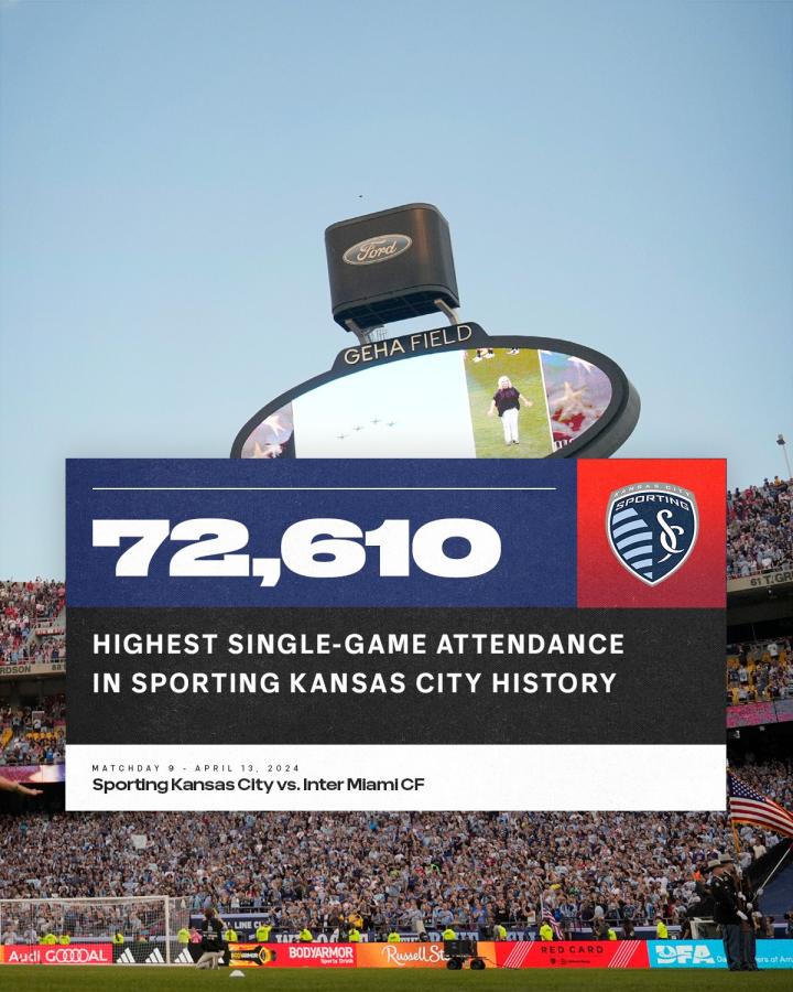 美职联常规赛,堪萨斯城体育主场2-3不敌迈阿密国际,本场比赛现场观众为72610人,据统计,这是美职联历史上单场上座人数第四高的比赛。