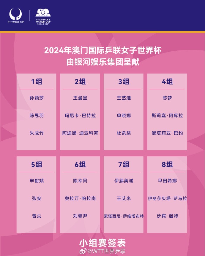 2024年国际乒联女子世界杯将于4月15日至21日在中国澳门举办。女单第一阶段的分组已经出炉,48位参赛选手分为16组。其中,中国选手蒯曼与韩国选手田志希将在小组中碰面。